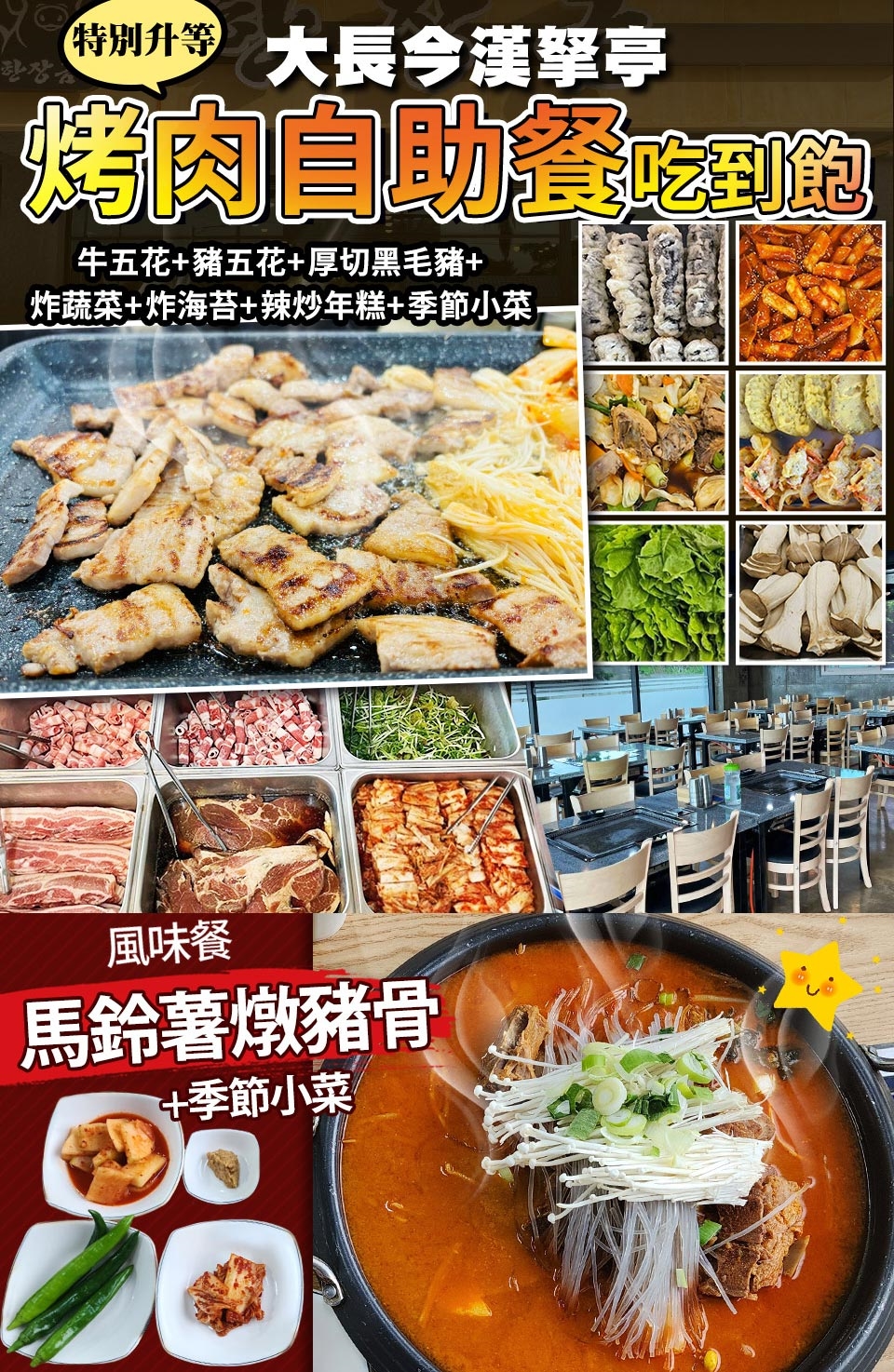 早餐:飯店內用 午餐:馬鈴薯燉豬骨湯 晚餐:大長今漢拏亭烤肉自助餐吃到飽~牛五花+豬五花+厚切黑毛豬+炸蔬菜+炸海苔+辣炒年糕+季節小菜 |