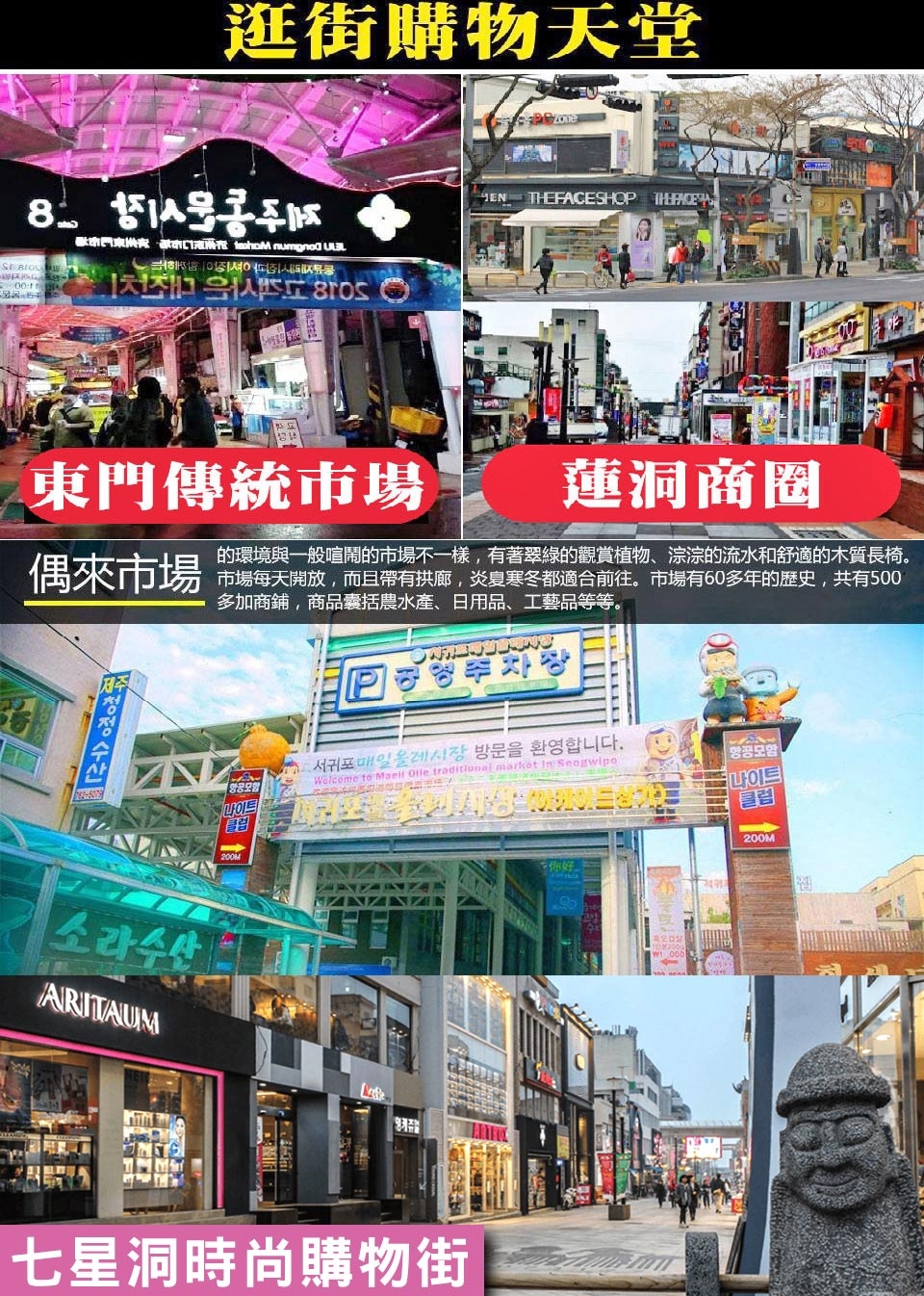 【精裝彩妝坊】相信愛美的女性朋友們ㄧ定可以在這挑選最新款最HITO彩粧品,讓辛苦的上班族及學生族群在忙碌生活中,ㄧ樣可以打造出時尚彩妝,讓您永遠跟上時代潮流尖端。 【偶來市場】的環境與一般喧鬧的市場不一樣,有著翠綠的觀賞植物、淙淙的流水和舒適的木質長椅。市場每天開放,而且帶有拱廊,炎夏寒冬都適合前往。市場有60多年的歷史,共有500多加商鋪,商品囊括農水產、日用品、工藝品等等。其中鮑魚、鯛魚、漢拿峰柑橘、濟州巧克力是人氣產品。