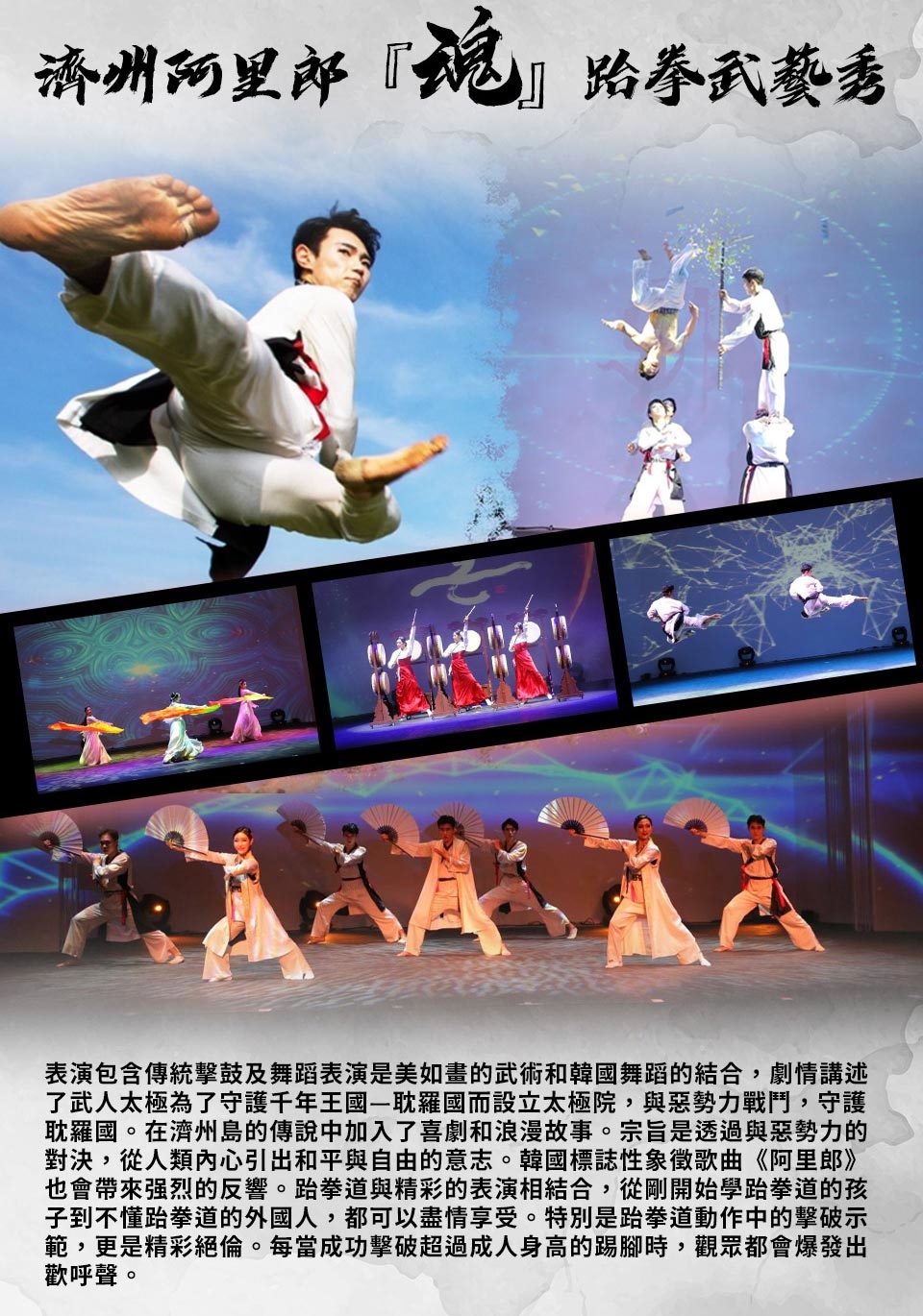 【濟州阿里郎『魂』跆拳武藝秀】表演包含傳統擊鼓及舞蹈表演是美如畫的武術和韓國舞蹈的結合,劇情講述了武人太極為了守護千年王國—耽羅國而設立太極院,與惡勢力戰鬥,守護耽羅國。在濟州島的傳說中加入了喜劇和浪漫故事。宗旨是透過與惡勢力的對決,從人類內心引出和平與自由的意志。韓國標誌性象徵歌曲《阿里郎》也會帶來强烈的反響。跆拳道與精彩的表演相結合,從剛開始學跆拳道的孩子到不懂跆拳道的外國人,都可以盡情享受。