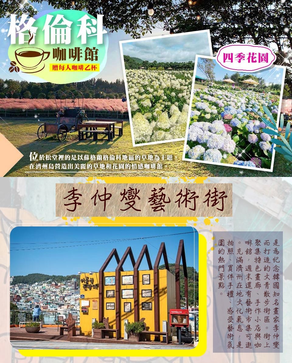 【Ecoland歐洲森林英式小火車】於2010年11月啟用,也是濟州島目前熱門的行程,全區瀰漫濃濃的歐洲童話風情共有五台英式小火車漫遊整個園區,是闔家出遊踏青或情侶散心最佳去處。 【格倫科四季花園咖啡館(贈每人咖啡乙杯)】位於松堂裡的是以蘇格蘭格倫科地區的草地為主題,在濟州島營造出美麗的草地和花園的情感咖啡館。紫陽花、繡球花、蕎麥花、油菜花等四季都盛開,可以享受到四季花香,是紫陽花的名產地之一。是一個可以度過浪漫時光和拍攝生活的地方隨著季節的變化。 早餐:內用早餐 午餐:鮑魚澎派海鮮鍋(章魚.螃蟹.時令貝類)+煎餅+拉麵+季節小菜 晚餐:方便逛街 敬請自理 |
