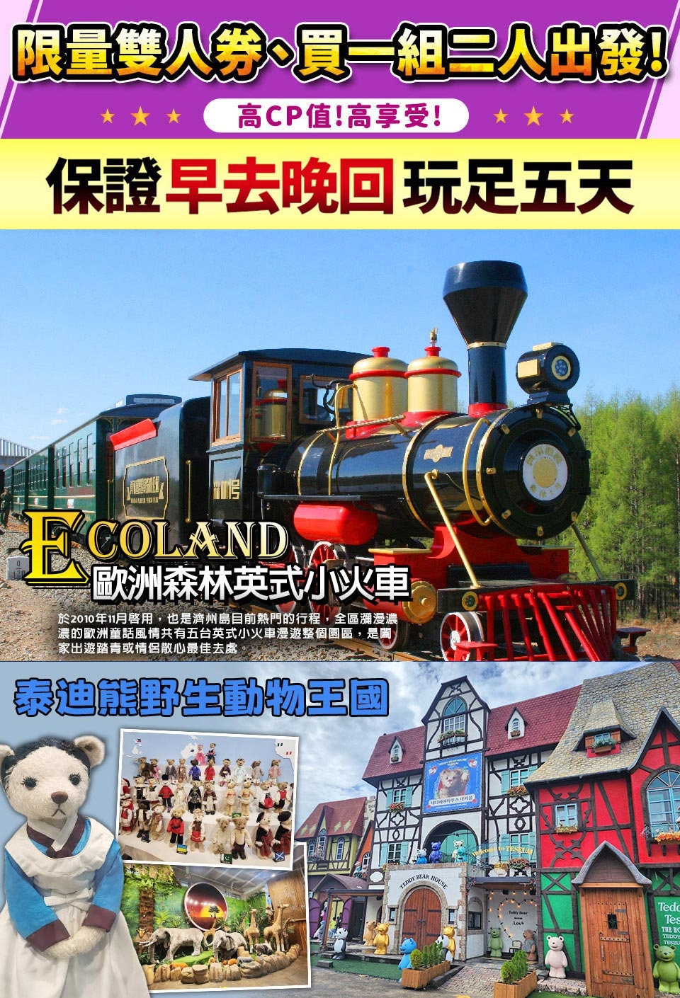 【第3天】 精裝彩妝坊-泰迪熊野生動物王國(贈送吊飾每人乙隻)-城邑民俗村【贈送每人一杯蜂蜜茶或五味子茶,2選1】-李仲燮藝術街-噢!雪綠茶博物館-偶來市場 |